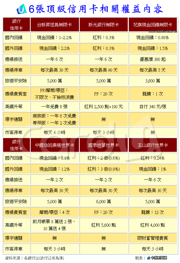 第2大重點在於信用卡是否提供免費的機場接送、機場貴賓室的福利,通常集中在頂級卡為最多,像是台新昇恆昌無限卡、新光無限卡、玉山世界卡…等,擁有1年6次免費機接,卡友出國不再出現大包、小包,全家人趕搭機場捷運的窘境。
